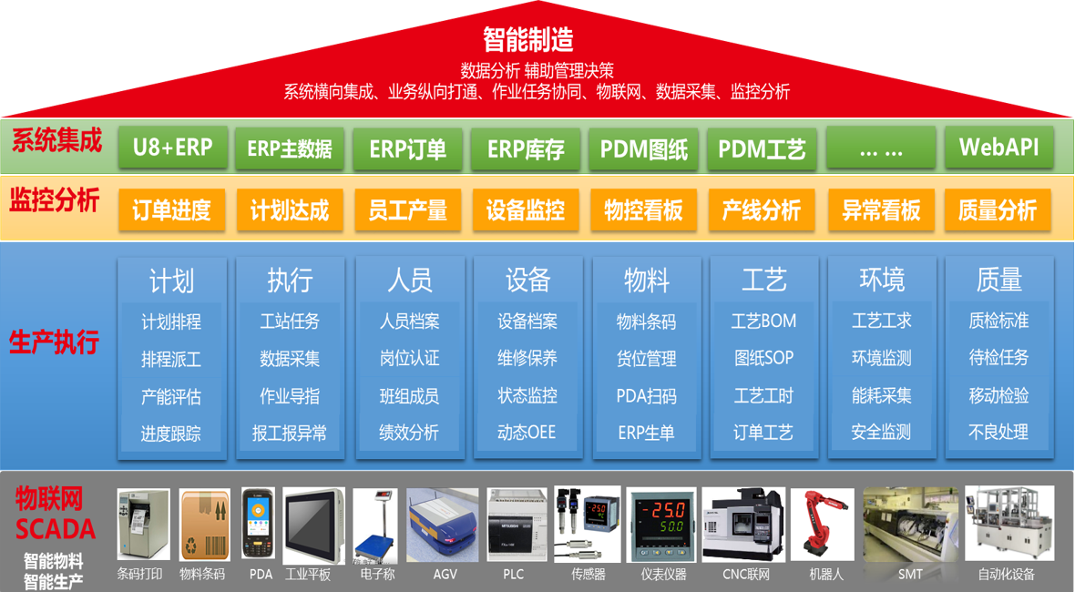U8+ MES智能工廠采用最新信息技術(shù)和網(wǎng)絡(luò)技術(shù),并結(jié)合JIT 精益生產(chǎn)、智能制造管理理念,實(shí)現(xiàn)了ERP數(shù)據(jù)共享、業(yè)務(wù)協(xié)同、與底層自動(dòng)化設(shè)備的PLC/SCADA等系統(tǒng)打通,MES對(duì)車間人、機(jī)、料、法、環(huán)、質(zhì)等生產(chǎn)要素進(jìn)行全面管控,實(shí)現(xiàn)企業(yè)精益制造和數(shù)字化管理。